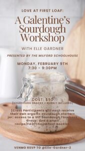 A Galentine’s Sourdough Workshop @ Milford Schoolhouse Join us as Elle Gardener presents this hands-on workshop! 59035 190th St., Nevada, Iowa + Add to Google Calendar + iCal / Outlook export 00 days 00 hours 00 minutes 00 seconds Date Feb 09 2026 Time 7:30 pm - 9:30 pm Share this event