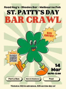 St. Patty’s Day Bar Crawl + Add to Google Calendar + iCal / Outlook export 00 days 00 hours 00 minutes 00 seconds Date Mar 14 2026 Time 6:00 pm - 11:00 pm Share this event