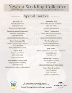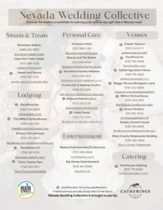 Gatherings, a beautiful event venue in the heart of our downtown, has put together a Nevada Wedding Collective brochure to help you navigate local wedding vendors easily. All you have to do is say “yes” to a local Nevada wedding!